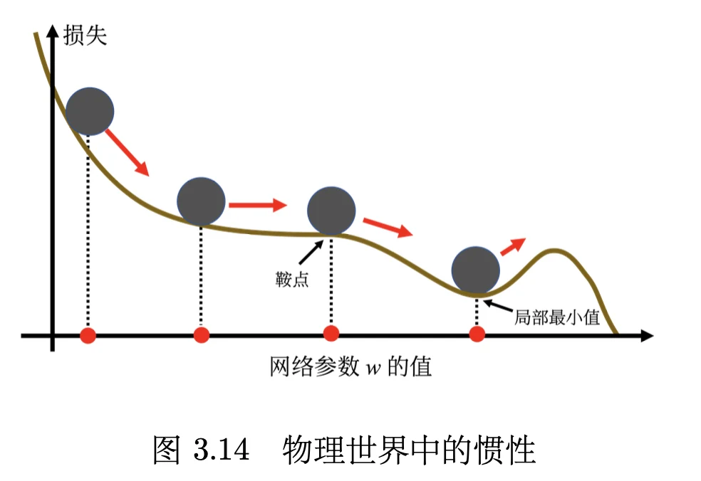 动量法(momentum method)是另外一个可以对抗鞍点或局部最小值的方法。如图 3.14 所示,假设误差表面就是真正的斜坡,参数是一个球,把球从斜坡上滚下来,如果使用梯度下降,球走到局部最小值或鞍点就停住了。 但是在物理的世界里,一个球如果从高处滚下来,就算滚到鞍点或鞍点,因为惯性的关系它还是会继续往前走。如果球的动量足够大,其甚至翻过小坡继续往前走。 因此在物理的世界里面,一个球从高处滚下来的时候,它并不一定会被鞍点或局部最小值卡住,如果将其应用到梯度下降中,这就是动量。