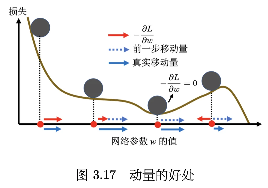 动量的简单例子如图 3.17 所示。红色表示负梯度方向,蓝色虚线表示前一步的方向,蓝色实线表示真实的移动量。一开始没有前一次更新的方向,完全按照梯度给指示往右移动参数。负梯度方向跟前一步移动的方向加起来,得到往右走的方向。一般梯度下降走到一个局部最小值或鞍点时,就被困住了。但有动量还是有办法继续走下去,因为动量不是只看梯度, 还看前一步的方向。即使梯度方向往左走,但如果前一步的影响力比梯度要大,球还是有可能继续往右走,甚至翻过一个小丘,也许可以走到更好的局部最小值,这就是动量有可能带来的好处。